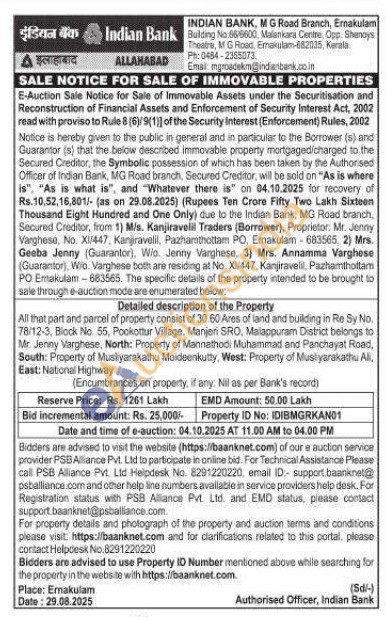 All that part and parcel of property consist of 30.60 Ares of land and building in Re Sy No. 78/12-3, Block No 55, Pookottur Village, Manjeri SRO, Malappuram District belongs to Mr. Jenny Varghese, North: Property of Mannathodi Muhammad and Panchayat Road, South: Property of Musliyarakathu Moideenkutty, West: Property of Musliyarakathu All, East: National Highway