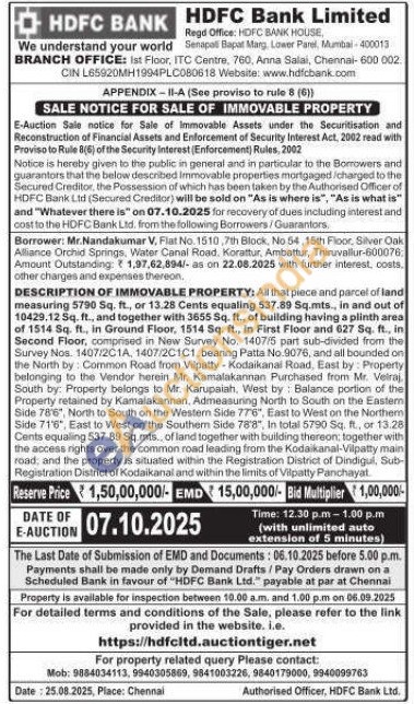 DESCRIPTION OF IMMOVABLE PROPERTY: All that piece and parcel of land measuring 5790 Sq. ft., or 13.28 Cents equaling 537.89 Sq.mts., in and out of 10429.12 Sq. ft., and together with 3655 Sq. ft., of building having a plinth area of 1514 Sq. ft., in Ground Floor, 1514 Sq. ft., in First Floor and 627 Sq. ft., in Second Floor, comprised in New Survey No. 1407/5 part sub-divided from the Survey Nos. 1407/201A, 1407/2C1C1, bearing Patta No.9076, and all bounded on the North by: Common Road from Vilpatty- Kodaikanal Road, East by: Property belonging to the Vendor herein Mr. Kamalakannan Purchased from Mr. Velraj South by: Property belongs to Mr. Karupalah, West by Balance portion of the Property retained by Kamalakannan, Admeasuring North to South on the Eastem Side 786", North to South on the Westem Side 776", East to West on the Northem Side 71'6", East to West on the Southern Side 788", In total 5790 Sq. ft, or 13.28 Cents equaling 537.89 Sq.mts. of land together with building thereon: together with the access rights over the common road leading from the Kodaikanal-Vilpatty main road, and the property is situated within the Registration District of Dindigul, Sub-Registration District of Kodaikanal and within the limits of Vilpatty Panchayat