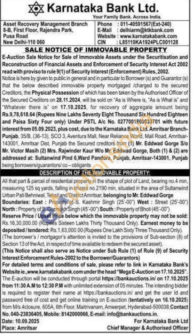 All that part & parcel of residential property in the shape of plot of Land, bearing no.4 min, measuring 125 sq yards, falling in khasra no.2190 min, situated in the area of Sultanwind Urban Pati Behniwal, Tehsil and District Amritsar, belonging to Mr. Eddwad Gorge Boundaries: East: Property of S. Kashmir Singh (25-00) West: Street (25-00") North: Property of S. Gurmukh Singh (45-00) South: Property of Bholi (45-00