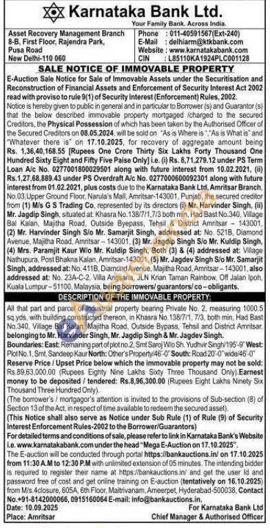 All that part and parcel of industrial property bearing Private No. 2. measuring 1000.5 sq.yds, with building constructed thereon, in Khasra No. 138/7/1, 7/3, both min, Had Bast No.340. Village Bal Kalan, Majitha Road, Outside Bypass, Tehsil and District Armritsar belonging to Mr. Harvinder Singh, Mr. Jagdip Singh & Mr. Jagdev Singh. Boundaries: East: Remaining part of plot no.2, Smt Saroj Wio Sh. Yudhvir Singh/195'-9 West Plot No.1, Smt. Sandeep Kaur North: Other's Property/46-0" South: Road 20-0" wide/46-0