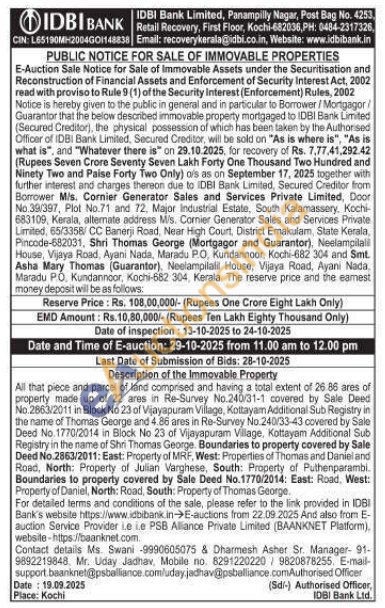 All that piece and parcel of land comprised and having a total extent of 26.86 ares of property made up of 22 ares in Re-Survey No.240/31-1 covered by Sale Deed No.2863/2011 in Block No 23 of Vijayapuram Village, Kottayam Additional Sub Registry in the name of Thomas George and 4.86 ares in Re-Survey No.240/33-43 covered by Sale Deed No. 1770/2014 in Block No 23 of Vijayapuram Village, Kottayam Additional Sub Registry in the name of Shri Thomas George. Boundaries to property covered by Sale Deed No.2863/2011: East: Property of MRF, West: Properties of Thomas and Daniel and Road, North: Property of Julian Varghese, South: Property of Puthenparambi Boundaries to property covered by Sale Deed No. 1770/2014: East: Road, West: Property of Daniel, North: Road, South: Property of Thomas George