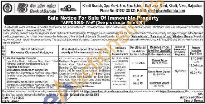 All that part and parcel of Equitable Mortgage of Residential Property situated at Ward No. 18, Gurjar Mohalla Khedi. Tehsil Kathumar, District Awar Rajasthan 321805 Admeasuring area 169.734 50 Moters (203 Sq. Yards) in the name of Shin Dinesh Chand Sio Stri Mangtu Ram & Shri Suresh Chand Bo Shri Manglu Ram Bounded by East Road West Gall, North Plot of Shri Deep Chand Sharma South Plot of Shen Ramwamop Khandelwal