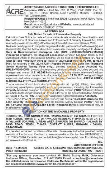 RESIDENTIAL FLAT NUMBER 1504, HAVING AREA OF 950 SQUARE FEET ON 15TH FLOOR, TOWER C-2. OF "AVALON RESIDENCY (PHASE II), SITUATED IN VILLAGE UDAIPUR, (URBAN AREA BHIWADI) ON BHIWADI ALWAR BY PASS ROAD, TEHSIL TIJARA, DISTRICT ALWAR, BHIWADI 301019. RAJASTHAN.