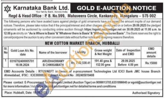 Karnataka Bank Gold Auctions Auction in Hubballi