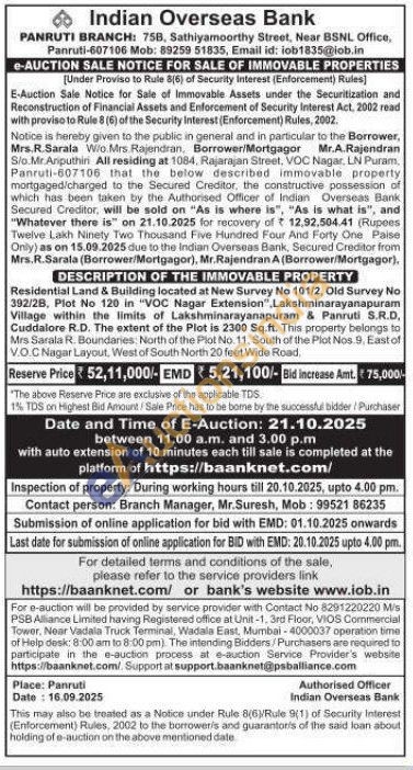 Residential Land & Building located at New Survey No 101/2, Old Survey No 392/28, Plot No 120 in "VOC Nagar Extension", Lakshminarayanapuram Village within the limits of Lakshminarayanapuram & Panruti S.R.D. Cuddalore R.D. The extent of the Plot is 2300 Sq.ft. This property belongs to Mrs Sarala R. Boundaries: North of the Plot No. 11, South of the Plot Nos. 9. East of V.O.C Nagar Layout, West of South North 20 feet Wide Road.