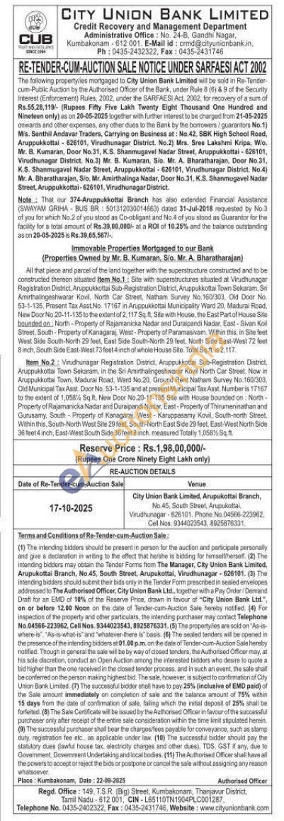All that piece and parcel of the land together with the superstructure constructed and to be constucted thereon situated Item No.1: Site with superstructures situated at Virudhunagar Registration Distict, Aruppukottal Sub-Registration District, Anppukkotta Town Sekaram, S Amirthalingeshwarar Kovil, North Car Street, Natham Survey No 160/303. Old Door Ne 53-1-135, Present Tax Asst.No. 17167 in Anuppurkottaa Municipality Ward 20, Madurai Road New Door Nic: 20-11-135 to the extent of 2,117 Swth House the East Part of House St bounded on, North Property of Rajamanicka Nadar and Duraipandi Nadar East-Sivan Koll Smet, South-Property of Kanagara West-Property of Paramasivam. Within this, in Site feat West Side South-North 29 feet. East Side South-North 20 feet North Side East-West 72 feet inch, South Side East-West 73 leet 4 inch of whole House Site. Total S2.117 Item No.2: Vrudhunagar Registration District, Aruppukkota Sub-Registration District Aruppukkottai Town Sekaram, in the Sri Amirthaingeshwarar Kovil North Car Sheet. Now in Aruppukkottai Town, Madurai Road, Ward No. 20, Ground Rent Natham Survey No. 160303 Old Municipal Tax Asst Door No 53-1-135 and at present Municipal Tax Asst. Number is 17167 to the extent of 1,05016 Sq.ft. New Door No. 20-11-135 Site with House bounded on North-Property of Rajamanicka Natar and Duraipandi Nadia, East-Property of Thirumerinathan and Gurusamy, South-Property of Kanagaraj, West Karuppasamy Kovil, South-north Sreet Within the South-North West Site 29 feet, South-North East Side 29 feet. East-West North Side 30 feet 4 inch East-West South Side 26 feet & inch measured Totally 1,058%