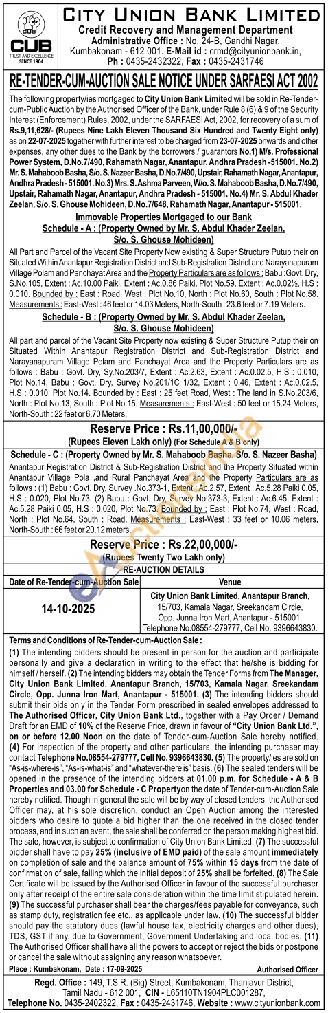 Schedule-C (Property Owned by Mr. S. Mahaboob Basha, S/o. S. Nazeer Basha) Anantapur Registration District & Sub-Registration District and the Property Situated within Anantapur Village Pola and Rural Panchayat Area and the Property Particulars are as follows: (1) Babu: Govt. Dry, Survey No 373-1, Extent: Ac 2.57, Extent Ac.5.28 Paiki 0.05. H.S: 0.020, Plot No.73. (2) Babu Govt. Dry, Survey No.373-3, Extent: Ac.5.45, Extent Ac.5.28 Palki 0.05, H.S: 0.020, Plot No.73. Bounded by: East: Plot No.74, West: Road, North Plot No.64, South Road. Measurements East-West: 33 feet or 10.06 meters. North-South: 66 feet or 20.12 meters.
