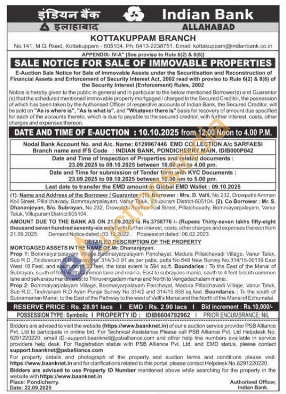 Prop 1: Bommaiyarpalayam Village, Boomaiyarpalayam Panchayat, Madura Pillaichavadi Village, Vanur Taluk, Sub R.D., Tindivanam R.D Survey No. 314/3-0.91 as per patta, patta No 648 New Survey No.314/15-00139 East West 18 Feet, and south north 33 feet, the total extent is 594 sq.ft. Boundaries: To the East of the Manai of Subrayan, south of feet width Common lane and mania, East to subrayans mania, south to 4 feet breath common lane and selvarasu manai, west to Thiruvengadam manai and North to Vengadachalam manai. Prop 2: Bommaiyarpalayam Village, Boomalyarpalayam Panchayat, Madura Pillaichavadi Village, Vanur Taluk, Sub R.D., Tindivanam R.D Ayan Punjai Survey No 314/2 and 314/15 858 sq. feet. Boundaries: To the south of Subramanian Manai, to the East of the Pathway to the west of Valli's Manai and the North of the Manai of Ezhumalai