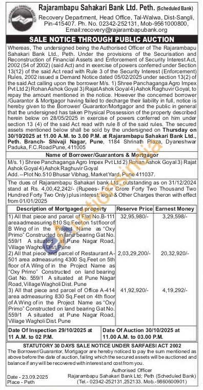 2) All that piece and parcel of Restaurant 501 area admeasuring 4300 Sq. Feet on 5th floor of A Wing of in the Project Name as "Oxy Primo" Constructed on land bearing Gat No. 559/1 A situated at Pune Nagar Road, Village Wagholi Dist. Pune