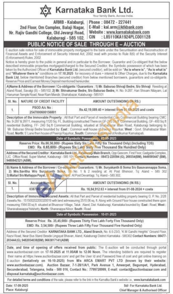 Description of the Immovable Property: All that Part and Parcel of residential Cum Commercial Building bearing CMC No. 9-287 & 287/1, measuring 1120 Sq. Ft, Building constructed There on GF-240 Sq. ft. Commercial Building, GF-400 Sqft residential Building, FF- 240 Sq It Commercial Building, situated at Shahabazar Man Road, Kalaburagi belonging to Mr. Baburao Shivaji Bedre bounded by East: Common wall house of Peeroji Rajurkar, West: Govt. Shahabazar Main Road, North: 5 Lane then house of Peeroji Rajurkar, South: Common wall house of Anilkumar Kamalapati