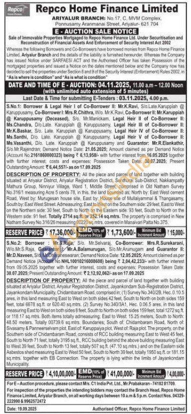 1) All the place and parcel of land together with building situated at Anyalur District, Ariyalur Registration District, Senthurai Sub-District, Nakkampatty Mathura Group, Ninniyur Village, Ward 1, Middle Street, comprised in Old Natham Survey No.316/1 measuring Acre 5 cents 78, in this, the land bounded as, North by: East West cement Road, West by: Murugesan house site, East by. House site of Mullaiyammal & Thangasamy, South by: East West Street Admeasuring, East to West on the Southem side: 29 feet, East to West on the Northern side: 30 feet, South to North on the Eastem side: 93 feet, South to North on the Westem side 91 feet. Totally 2714 sq.ft. or 252.14 sq.mtrs. The property is comprised in New Natham Survey No.316/26 measuring 00220 sq mtrs. covered in Manaivan Palta No. 375