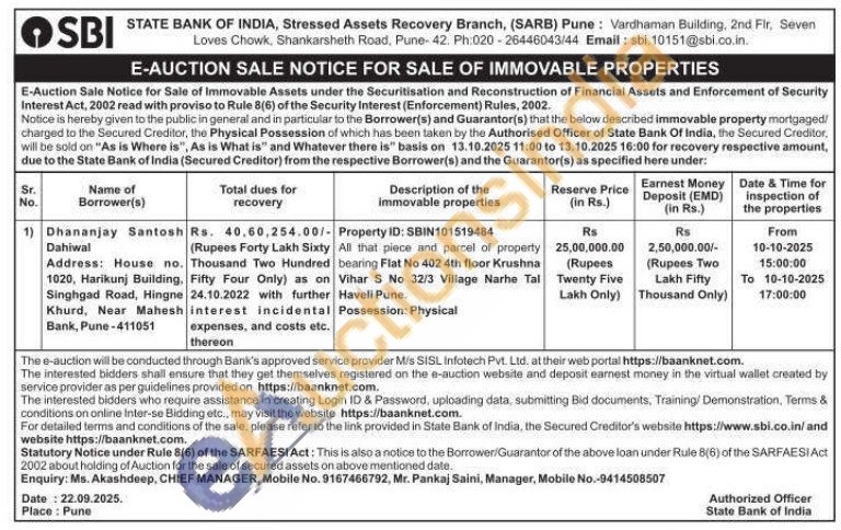 All that piece and parcel of property bearing Flat No 402 4th floor Krushna Vihar S No 32/3 Village Narhe Tal Haveli Pune. Possession: Physical