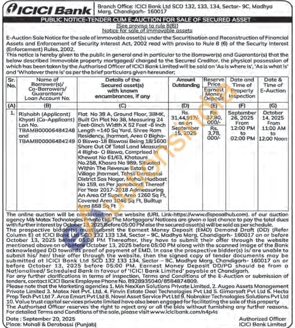 Flat No 38 A, Ground Floor, 3BHK, Built On Plot No 38, Measuring 24 Feet-Dinch Width X 52 Feet -6 inch Length=140 Sq Yard, Shree Ram Residency, Jharmari, Area 0 Bigha-0 Biswa-18 Biswasi Being 18/1600 Share Out Of Total Land Measuring 4 Bigha- O Biswa, Comprised in Khewat No 61/63, Khatauni No.258, Khosra No 989, Situated Within The Revenue Estate Of Village Jharmari, Tehsil Derabassi District Sas Nagar, Mohali Hadbast No 159, as Per Janabandi Thereaf For Year 2017-2018 Admeasuring An Area Of Super Area 1260 Sq Ft, Covered Area 1048 Sq Ft, Builtup Area 858 Sq Ft