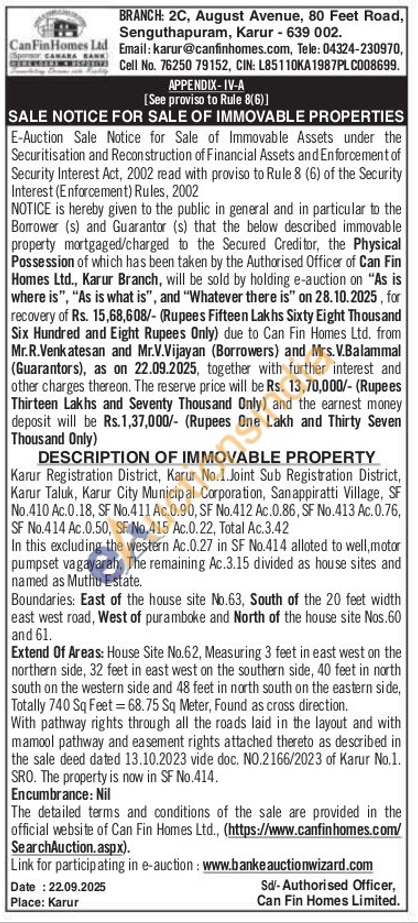 Karur Registration District, Karur No.1. Joint Sub Registration District, Karur Taluk, Karur City Municipal Corporation, Sanappiratti Village, SF No.410 Ac.0.18, SF No.411 Ac.0.90, SF No.412 Ac.0.86, SF No.413 Ac. 0.76, SF No.414 Ac.0.50, SF No.415 Ac.0.22, Total Ac.3.42 In this excluding the western Ac.0.27 in SF No.414 alloted to well, motor pumpset vagayarah, The remaining Ac.3.15 divided as house sites and named as Muthu Estate. Boundaries: East of the house site No.63, South of the 20 feet width east west road, West of puramboke and North of the house site Nos.60 and 61. Extend Of Areas: House Site No.62, Measuring 3 feet in east west on the northern side, 32 feet in east west on the southern side, 40 feet in north south on the western side and 48 feet in north south on the eastern side, Totally 740 Sq Feet = 68.75 Sq Meter, Found as cross direction. With pathway rights through all the roads laid in the layout and with mamool pathway and easement rights attached thereto as described in the sale deed dated 13.10.2023 vide doc. NO.2166/2023 of Karur No.1. SRO. The property is now in SF No.414