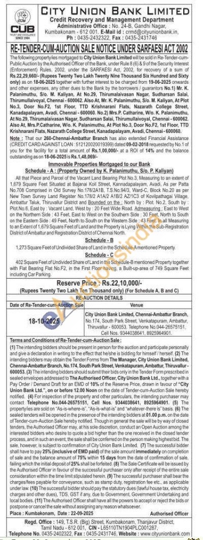 Alt that Plece and Parcel of the Vacant Land Bearing Plot No.3. Measuring to an extent of 1,679 Square Fest Situated at Bajanai Koil Street, Kannadapalayam, Avad. As per Patta No.708 Comprised in Old Survey No 178/2A1B, TS No. 94/3, Ward-C. Block No.20 as per New Town Survey Land Register No.178/2 A1A/2 A18/2 AZ/1C3 of Kovilpathagai Willage. Ambattur Taluk, Thinnalur District and Bounded on the North by: Plot No. 2. South by: Plot No.6. East by Vacant Land, West by: 20 Feet Wide Road. Admeasuring East to West on the Northern Side: 43 Feet, East to West on the Southem Side 30 Feet, North to South on the Eastern Side: 49 Feet, North to South on the Western Side: 43 Feet. In all Measuring to an Extent of 1,679 Square Feet of Land and the Property is Lying Within the Sub-Registration District of Amtattur and Registration District of Chernal North Schedule-B 1,273 Square Feet of Undivided Share of Land in the Schedule-Ameritioned Property Schedule-C 402 Square Feet of Undivided Share of Land in the Schedule-B mentioned Property together with Flat Bearing Flat No.F2, in the First Floor having, a Built-up-arsa of 749 Square Feet including Car Parking