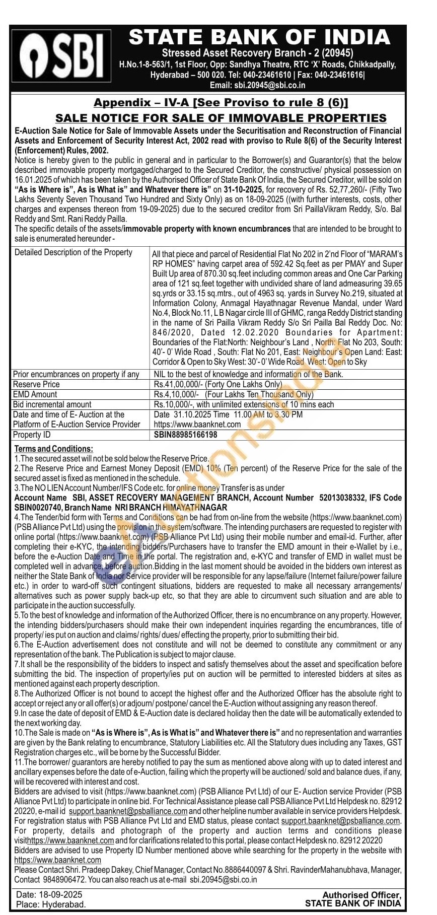 All that piece and parcel of Residential Flat No 202 in 2'nd Floor of "MARAM's RP HOMES" having carpet area of 592.42 Sq feet as per PMAY and Super Built Up area of 870.30 sq. feet including common areas and One Car Parking area of 121 sq feet together with undivided share of land admeasuring 39.66 sq.yrds or 33.15 sq mitrs., out of 4963 sq. yards in Survey No.219, situated at Information Colony, Anmagal Hayathnagar Revenue Mandal, under Ward No.4. Block No. 11. LB Nagar circle III of GHMC, ranga Reddy District standing in the name of Sri Paila Vikram Reddy Sio Sri Paila Bal Reddy Doc. No: 846/2020, Dated 12.02.2020 Boundaries for Apartment: Boundaries of the Flat:North: Neighbour's Land, North: Flat No 203, South: 40-0' Wide Road, South: Fiat No 201, East: Neighbour's Open Land: East: Corridor & Open to Sky West: 30-0' Wide Road West: Open to Sky