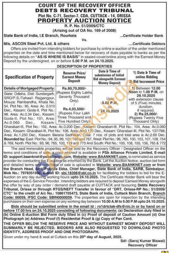 State: Odisha, Dist: Sundargarh SRO/P.S./Tahasil: Rajgangpur, Mouza: Ranibandha, Khata No. 54, Plot No.: 95, Area: Ac. 0.510 Dec., Kissam: Goda-II, Plot No.: 98. Area: Ac.0.34 Dec., Kissam Goda-II, Plot No.: 101, Area Ac.0.060 Dec.. Kissam Gharabari-III, Plot No.: 102, Area: Ac.0.200 Dec., Kissam: Gharabari-III, Plot No.: 104, Area: Ac.0.060 Dec., Kissam: Gharabari-III, Plot No.: 106, Area: Ac.0.170 Dec., Kissam: Gharabari-III, Plot No. 137/768, Area: Ac.1.250 Dec., Kissam: Berana Sadharan, Total: 7 nos. of plots and total area is Ac.2.69 Dec. Bounded by: East: Plot No.: 94, 95, 99, 101, 765 and 767, West: Plot No.: 96, 765, 100, 103, 107, 108, 754 & 769, North: Plot No.: 93, 96, 765, 103, 119 and 773 And South: Plot No.: 100, 108, 155, 156, 765 & 772