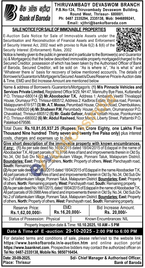 Give short description of the immovable property with known encumbrances, if any: (1) As per sale deed No. 1659/2015 dated 18/04/2015 of Edappal in the name of Aboobacker T.K, All part parcels of 10.9766 Ares of land and improvements therein in Old Sy. No.34, Old Sub Div No.2 of Vattamkulam Village, Ponnani Taluk, Malapuram District. Boundaries: East: Property of others, North: Property of others, West: Panchayath road, South: Remaining property. (2) As per sale deed No. 1660/2015 dated 18/04/2015 of Edappal in the name Aboobacker T.K, All part parcels of 10.9766 Ares of land and improvements therein in Old Sy. No.34, Old Sub Div No.2 of Vattamkulam Village, Ponnani Taluk, Malapuram District. Boundaries: East: Property of others, North: Remaining property, West: Panchayath road, South: Remaining property. (3) As per sale deed No. 1661/2015, dated 18/04/2015 of Edappal in the name of Aboobacker T.K, All part parcels of 09.0988 Ares of land and improvements therein in Old Sy. No.34, Old Sub Div No.2 of Vattamkulam Village, Ponnani Taluk, Malapuram District. Boundaries: East: Property of others, North: Property of others, West: Panchayath road, South: Remaining property