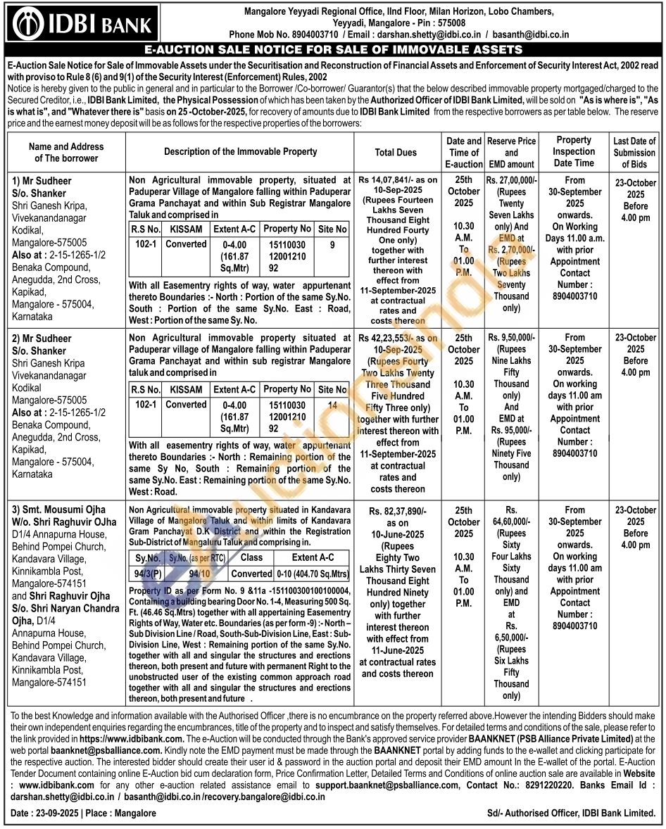 Contact Phone Mob No. 8904003710/Email: darshan.shetty@idbi.co.in/basanth@idbi.co.in