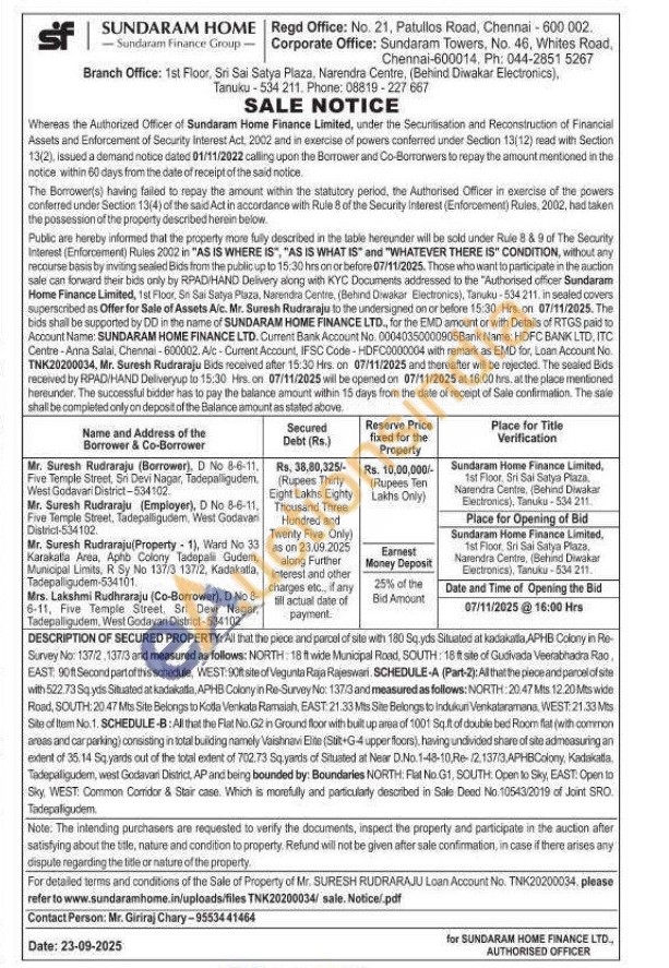 All that the piece and parcel of site with 180 Sq.yds Situated at kadaikalla, APHB Colony in Re Survey No: 137/2, 137/3 and measured as follows: NORTH: 18 ft wide Municipal Road, SOUTH: 18 ft site of Gudivada Veerabhadra Rao, EAST: 90ft Second part of this schedule, WEST:90ft site of Vegunta Raja Rajeswari, SCHEDULE-A (Part-2): All that the piece and parcel of site with 522.73 Sq yds Situated at kadakatia, APHB Colony in Re-Survey No: 137/3 and measured as follows: NORTH: 20.47 Mts 12.20 Mts wide Road, SOUTH: 20.47 Mts Site Belongs to Kotla Venkata Ramaiah, EAST: 21.33 Mts Site Belongs to Indukuri Venkataramana, WEST:21.33 Mts Site of Item No.1. SCHEDULE-B: All that the Flat No. G2 in Ground floor with built up area of 1001 Sq.ft of double bed Room flat (with common areas and car parking) consisting in total buliding namely Vaishnavi Elite (Stit+G-4 upper floors), having undivided share of site admeasuring an extent of 35.14 Sq yards out of the total extent of 702.73 Sq yards of Situated at Near D.No.1-48-10,Re-12.137/3, APHBColony, Kadakatta, Tadepaligudem, west Godavari District, AP and being bounded by: Boundaries NORTH. Flat No G1, SOUTH: Open to Sky, EAST: Open to Sky, WEST: Common Comidor & Stair case. Which is morefully and particularly described in Sale Dead No. 10543/2019 of Joint SRO. Tadepaligudem