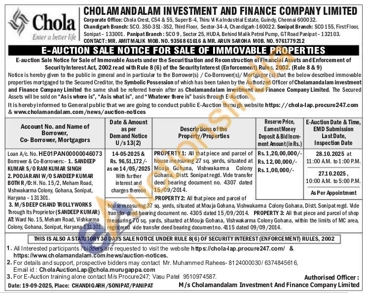 PROPERTY 2: All that piece and parcel of house measuring 37 sq. yards, situated at Mouja Gohana, Vishwakarma Colony Gohana, Distt Sonipat regd. Vide transfer deed bearing document no. 4305 dated 15/09/2014. PROPERTY 3: All that piece and parcel of shop measuring 70 sq. yards, situated at Mouja Gohana, Vishwakarma Colony Gohana, within the limits of MC area, registered vide transfer deed bearing documentno. 4115 dated 09/09/2014.