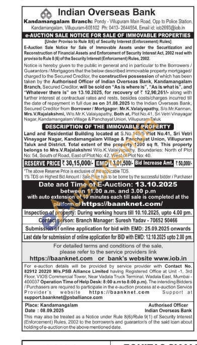 Land and Residential Building located at S.No. 145/5 Plot No.41, Sri Vetri Vinayagar Nagar, Kandamangalam Village & Panchayat Union, Villupuram Taluk and District. Total extent of the property 1200 sq ft. This property belongs to Mrs. V. Rajalakshmi Wio.K. Valaiyapathy. Boundaries: North of Plot No: 54, South of Road, East of Plot No: 42. West of Plot No: 40