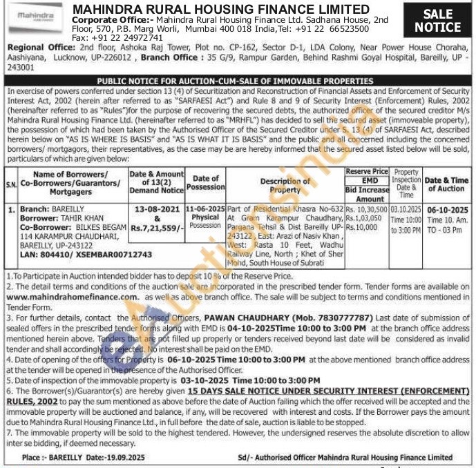 Part of Residential Khasra No-632 At Gram Karampur Chaudhary, Pargana Tehsil & Dist Bareilly UP- 243122, East: Arazi of Nasiv Khan, West: Rasta 10 Feet, Wadhu Railway Line, North; Khet of Sher Mohd, South House of Subrati