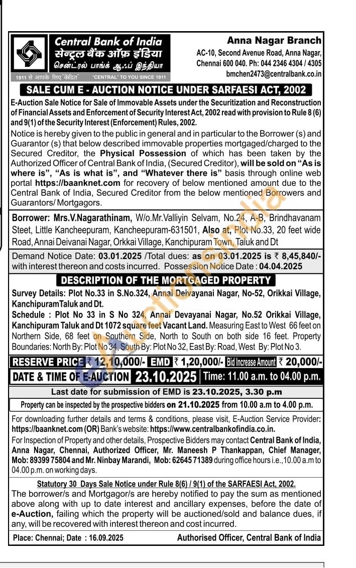 Survey Details: Plot No.33 in S.No.324, Annai Deivayanai Nagar, No-52, Orikkai Village, Kanchipuram Taluk and Dt. Schedule: Plot No 33 in S No 324, Annai Devayanai Nagar, No.52 Orikkai Village, Kanchipuram Taluk and Dt 1072 square feet Vacant Land. Measuring East to West 66 feet on Northern Side, 68 feet on Southern Side, North to South on both side 16 feet. Property Boundaries: North By: Plot No 34, South By: Plot No 32, East By: Road, West By: Plot No 3.