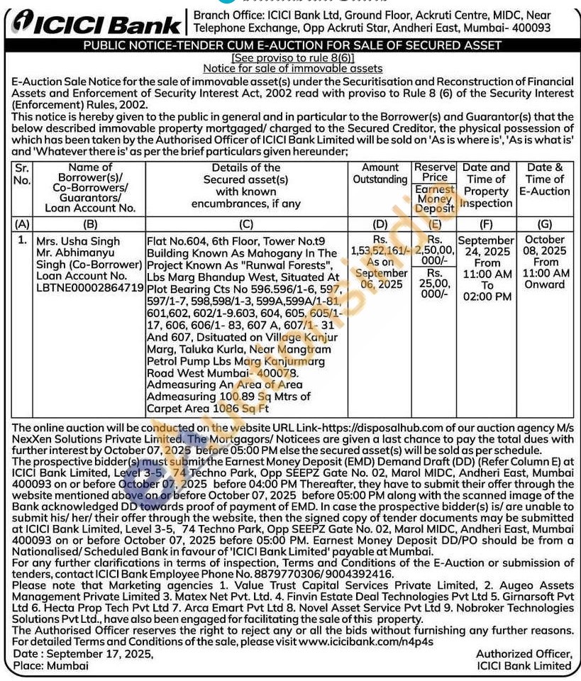 Flat No.604, 6th Floor, Tower No.t9 Building Known As Mahogany In The Project Known As "Runwal Forests", Lbs Marg Bhandup West, Situated At Plot Bearing Cts No 596.596/1-6, 597, 597/1-7, 598,598/1-3, 599A,599A/1-81, 601,602, 602/1-9.603, 604, 605, 605/1-17, 606, 606/1-83, 607 A, 607/1-31 And 607, Dsituated on Village Kanjur Marg, Taluka Kurla, Near Mangtram Petrol Pump Lbs Marg Kanjurmarg Road West Mumbai- 400078. Admeasuring An Area of Area Admeasuring 100.89 Sq Mtrs of Carpet Area 1086 Sq Ft