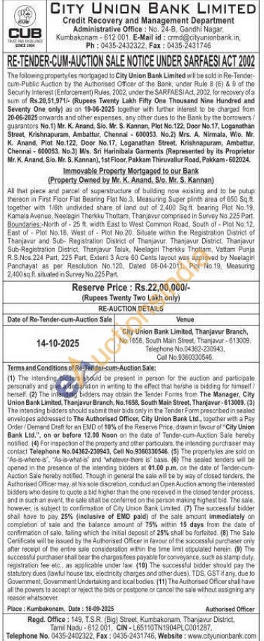 Immovable Property Mortgaged to our Bank (Property Owned by Mr. K. Anand, S/o. Mr. S. Kannan) :All that piece and parcel of superstructure of building now existing and to be putup thereon in First Floor Flat Bearing Flat No.3, Measuring Super plinth area of 650 Sq.ft. together with 1/6th undivided share of land out of 2,400 Sq.ft. bearing Plot No.19. Kamala Avenue, Neelagiri Therkku Thottam, Thanjavur comprised in Survey No.225 Part Boundaries:-North of 25 ft. width East to West Common Road, South of Plot No. 12. East of Plot No.18, West of Plot No.20. Situate within the Registration District of Thanjavur and Sub- Registration District of Thanjavur. Thanjavur District. Thanjavur Sub-Registration District, Thanjavur Taluk, Neelagiri Therkku Thottam, Vattam Punja R.S.Nos.224 Part, 225 Part, Extent 3 Acre 60 Cents layout was approved by Neelagiri Panchayat as per Resolution No.120, Dated 08-04-2011. Plot No.19. Measuring 2,400 sq.ft. situated in Survey No. 225 Part