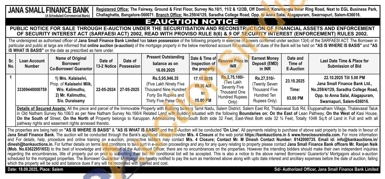 Details of Secured Assets: All the piece and parcel of the Immovable Property with Building bearing Tamil Nadu, Salem District, Salem East Rd, Thalaivasal Sub Rd, Eluppanatham Village, Thalaivasal Taluk in Old Natham Survey No. 106/3 as per New Natham Survey No. 166/4 Related Land with Building situated with the following Boundaries on: On the East of Lean Pathway, On the West of Kasi House, On the South of Street, On the North of Property belongs to Karuppan. Admeasuring North-South Both side 32 Feet, East-West Both side 32% Feet, Totally 1048 Sq.ft of Land in Full and with all pathway rights and easement rights annexed thereto.
