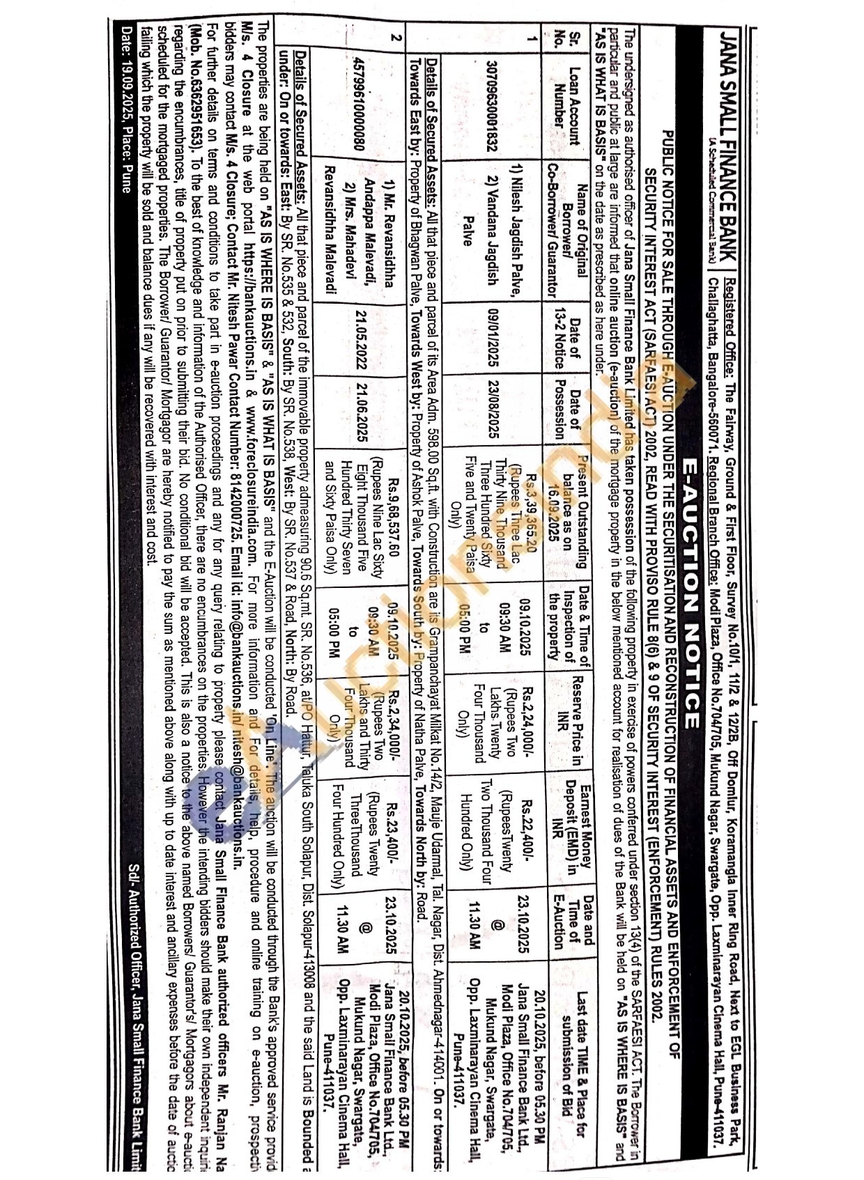 Details of Secured Assets: All that piece and parcel of its Area Adm. 598.00 Sq.ft. with Construction are its Grampanchayat Milkat No.14/2, Mauje Udarmal, Tal. Nagar, Dist. Ahmednagar-414001. On or towards: Towards East by: Property of Bhagwan Palve, Towards West by: Property of Ashok Palve, Towards South by: Property of Natha Palve, Towards North by: Road