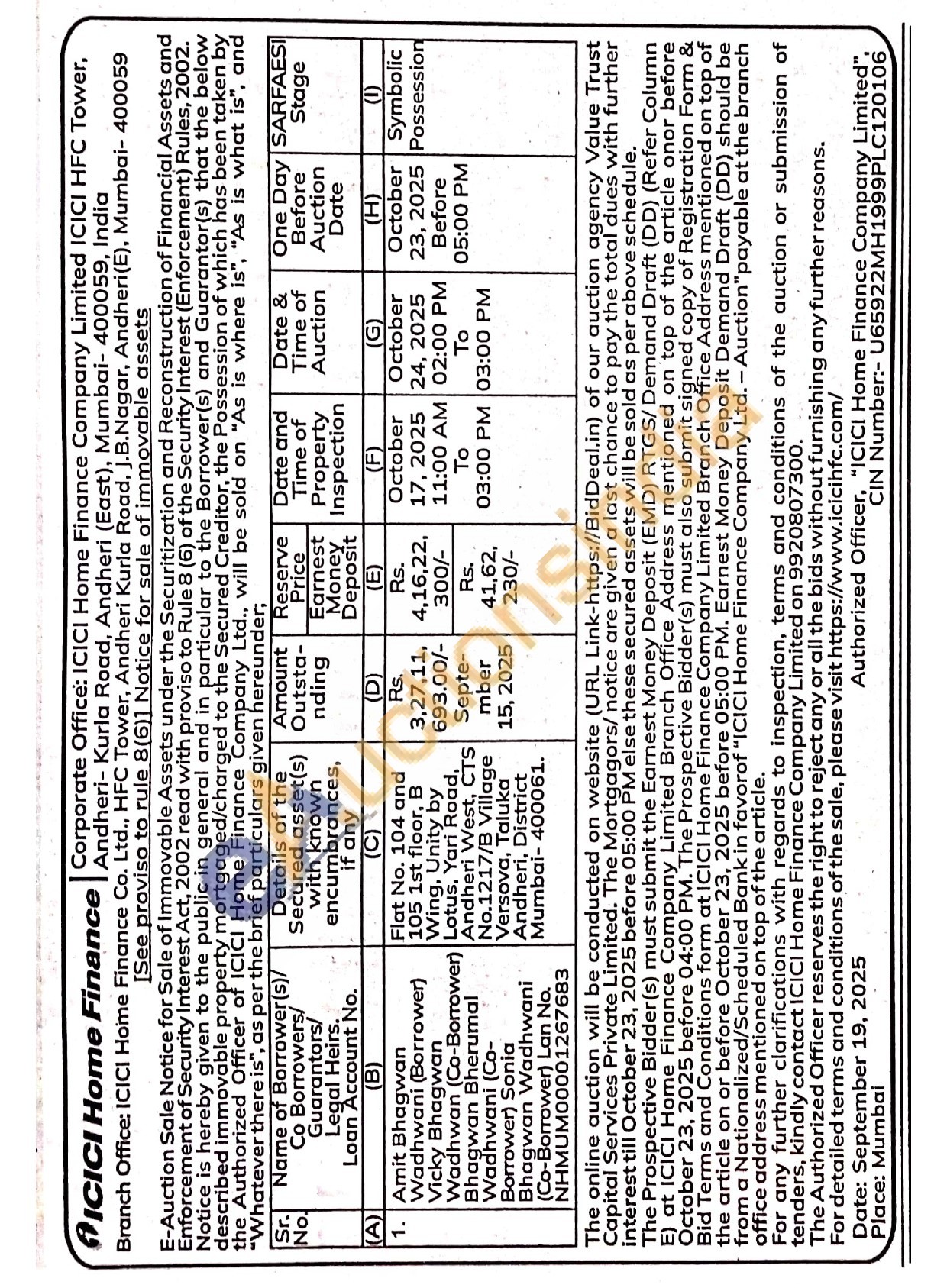 Flat No. 104 and 105 1st floor, B Wing, Unity by Lotus, Yari Road, Andheri West, CTS No.1217/B Village Versova, Taluka Andheri, District Mumbai-400061