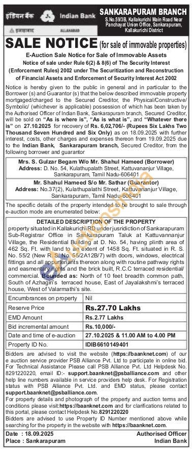 property situated in Kallakurichi RD under jusridiction of Sankarapuram Sub-Registrar Office in Sankarapuram Taluk at Kattuvannanjur Village, the Residential Building at D. No. 54, having plinth area of 462 Sq. Ft. with land to an extent of 1458 Sq. Ft. situated in R. S. No. 55/2 (New R. S. No. 55/2A12B/7) with doors, windows, electrical fittings and all appurtenants thereon along with routine pathway rights and easmentary rights and the brick built, R.C.C terraced residential/commercial. Bounded as: North of 10 feet breadth common path, South of Azhagiri's terraced house, East of Jayalakshmi's terraced house, West of Valarmathi's site.