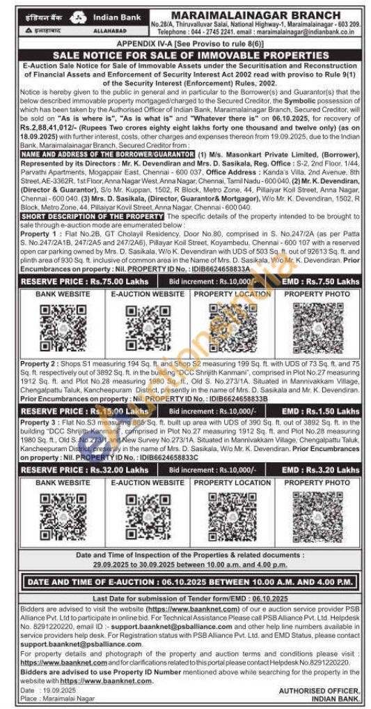 Property 2: Shops $1 measuring 194 Sq. ft. and Shop S2 measuring 199 Sq. ft. with UDS of 73 Sq. ft. and 75 Sq. ft. respectively out of 3892 Sq. ft. in the building "DCC Shrijith Kanmani", comprised in Plot No.27 measuring 1912 Sq. ft. and Plot No.28 measuring 1980 Sq. ft., Old S. No.273/1A, Situated in Mannivakkam Village, Chengalpattu Taluk, Kancheepuram District, presently in the name of Mrs. D. Sasikala and Mr. K. Devendiran. Prior Encumbrances on property: Nil. PROPERTY ID No.: IDIB66246588338