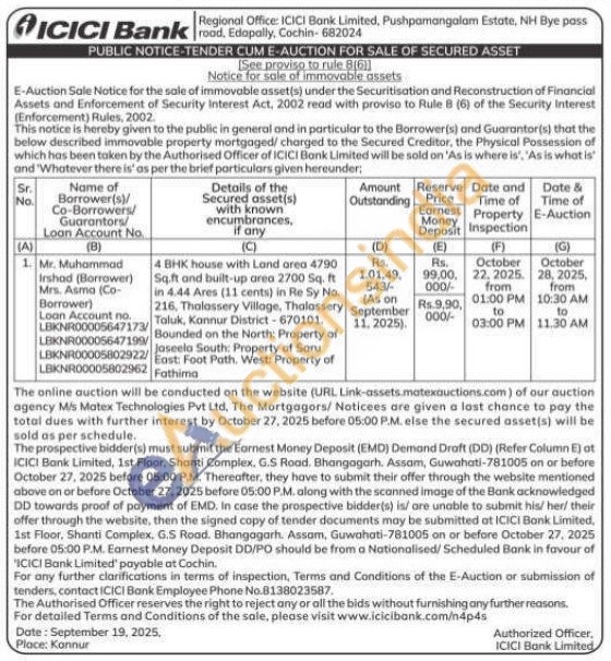 4 BHK house with Land area 4790 Sq.ft and built-up area 2700 Sq. ft in 4.44 Ares (11 cents) in Re Sy No. 216. Thalassery Village, Thalassery Taluk, District-670101. Bounded on the North: Property of Jaseela South: Property of Saru East: Foot Path. West: Property of Fathima