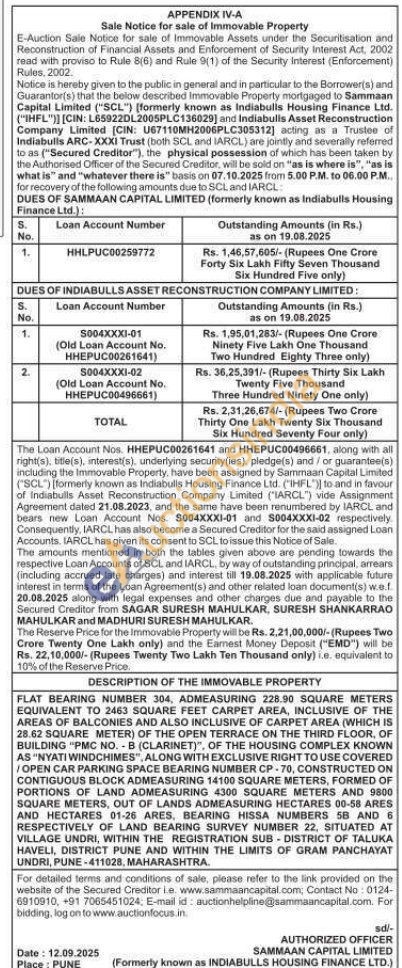 FLAT BEARING NUMBER 304, ADMEASURING 228.90 SQUARE METERS EQUIVALENT TO 2463 SQUARE FEET CARPET AREA, INCLUSIVE OF THE AREAS OF BALCONIES AND ALSO INCLUSIVE OF CARPET AREA (WHICH IS 28.62 SQUARE METER) OF THE OPEN TERRACE ON THE THIRD FLOOR, OF BUILDING "PMC NO.B (CLARINET)", OF THE HOUSING COMPLEX KNOWN AS "NYATI WINDCHIMES", ALONG WITH EXCLUSIVE RIGHT TO USE COVERED /OPEN CAR PARKING SPACE BEARING NUMBER CP-70, CONSTRUCTED ON CONTIGUOUS BLOCK ADMEASURING 14100 SQUARE METERS, FORMED OF PORTIONS OF LAND ADMEASURING 4300 SQUARE METERS AND 9800 SQUARE METERS, OUT OF LANDS ADMEASURING HECTARES 00-58 ARES AND HECTARES 01-26 ARES, BEARING HISSA NUMBERS 58 AND 6 RESPECTIVELY OF LAND BEARING SURVEY NUMBER 22, SITUATED AT VILLAGE UNDRI, WITHIN THE REGISTRATION SUB-DISTRICT OF TALUKA HAVELI, DISTRICT PUNE AND WITHIN THE LIMITS OF GRAM PANCHAYAT UNDRI, PUNE-411028, MAHARASHTRA.