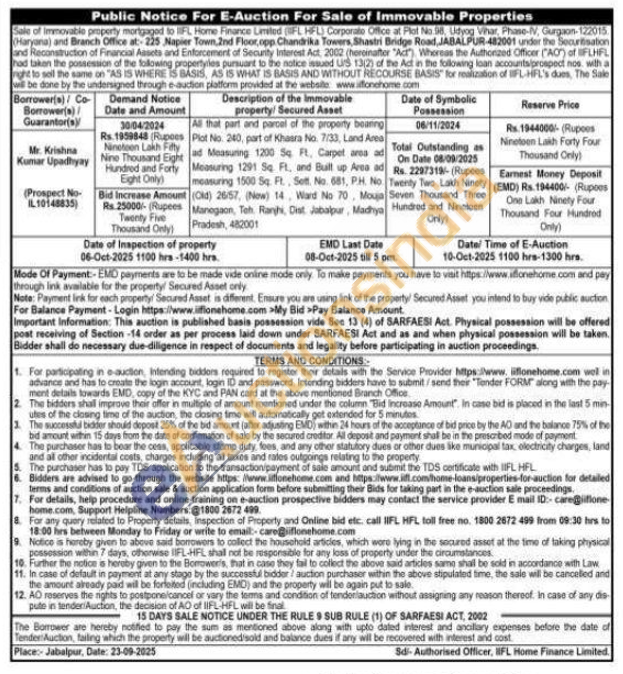 All that part and parcel of the property bearing Plot No. 240, part of Khasra No. 7:33, Land Area ad Measunng 1200 Sq Ft, Carpet area ad Measuring 1291 Sq Ft. and Bull up Area ad measuring 1500 Sq. Ft. Sell. No. 681, P.H. No (Old) 26/57, (New) 14, Ward No 70, Mouja Manegaon, Teh. Raghi, Dist. Jabalpur, Madhya Pradesh, 482001