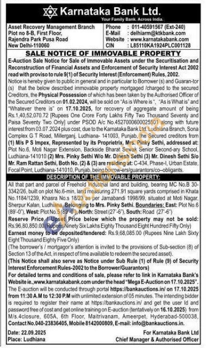 All that part and parcel of Freehold Industrial land and building, bearing MC No.8 30-3342/26, built on plot No.6-min, land measuring 271.91 square yards comprised in Khata No. 1184/1239, Khasra No.s 18/23 as per Jamabandi 1998/99, situated at Moti Nagar. Sherpur Kalan, Ludhiana, Belonging to Mrs. Pinky Sethi. Boundaries: East: Plot No.6 (89-0), West: Plot No.5 (89-07), North: Street (27-6"), South: Road (27-6)