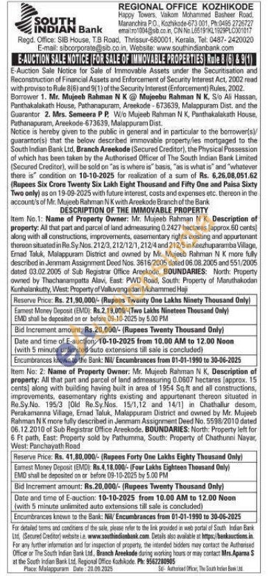 Item No: 2: Name of Property Owner: Mr. Mujeeb Rahman NK. Description of property: All that part and parcel of land admeasuring 0.0607 hectares (approx. 15 cents) along with building having built in area of 1954 Sq.ft and all constructions, improvements, easementary rights existing and appurtenant thereon situated in Re.Sy.No. 195/3 (Old Re.Sy.Nos. 15/1,12 and 14/1) in Chathallur desom, Perakamanna Village, Ernad Taluk, Malappuram District and owned by Mr. Mujeeb Rahman NK more fully described in Jenmam Assignment Deed No. 5598/2010 dated 06.12.2010 of Sub Registrar Office Areekode, BOUNDARIES: North: Property left for 6 Ft path, East: Property sold by Pathumma, South: Property of Chathunni Nayar, West: Panchayath Road