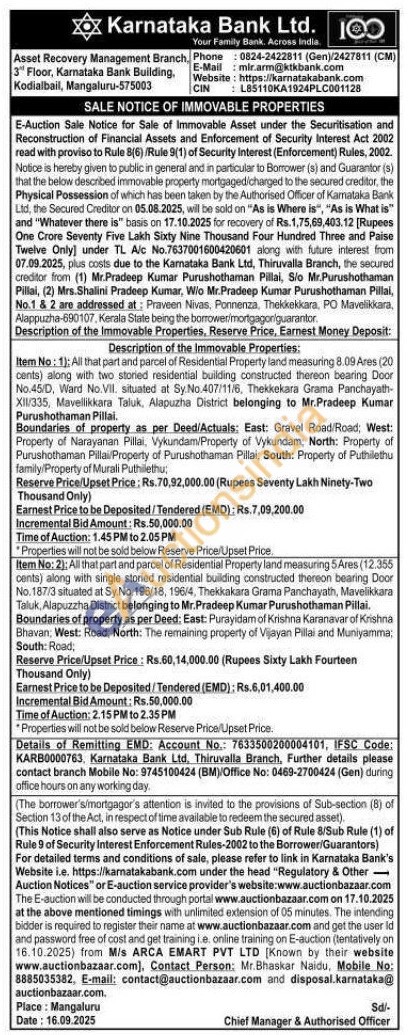 No: 2): All that part and parcel of Residential Property land measuring 5 Ares (12.355 cents) along with single storied residential building constructed thereon bearing Door No. 187/3 situated at Sy No. 196/18, 196/4, Thekkakara Grama Panchayath, Mavelikkara Taluk, Alapuzzha District belonging to Mr. Pradeep Kumar Purushothaman Pillai. Boundaries of property as per Deed: East: Purayidam of Krishna Karanavar of Krishna Bhavan, West: Road, North: The remaining property of Vijayan Pillai and Muniyamma; South: Road;