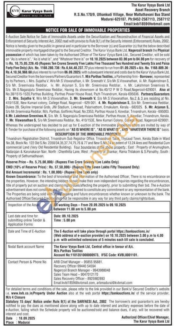 Trivandrum Registration District, Trivandrum Sub Registrar Office, Trivandrum Taluk. Thycaud Town, Kerala State in Ward No.38, Block No. 122 Old S.No. 2350/34,35,37,74,75,76 & 77 and New S.No. 74 an extent of 13.24 Ares and Residential Cum commercial Land (Very Old Residential Building). Four boundaries of the above property: East: Property of Arumugham, Nadarajan & Karunakaran Nair, North: Chenthitta Lane, West: Property of Shankar, Rama Thilakom & S.Parvathy, South: Property of Sethumadhavan.