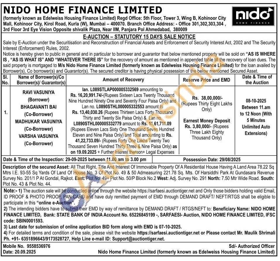 All That Right, Title And Interest Of Immovable Property Of A Residential House Having A Land Area 78.22 Sq Mtrs I.E. 93-55 Sq Yards Of Land Of House No. 3 Of Plot No. 49 & 50 Admeasuring 221.78 Sq. Mts. Of Harsiddhi Park At Gundasara Revenue Survey No. 201/1 P At Gondal, Rajkot. East: Plot No. 49+ Plot No. 50/P Block No.2 West: Adj. Survey No. 291 North: 7.50 Mtr Wide Road. South: Plot No. 43 & Plot No. 44.