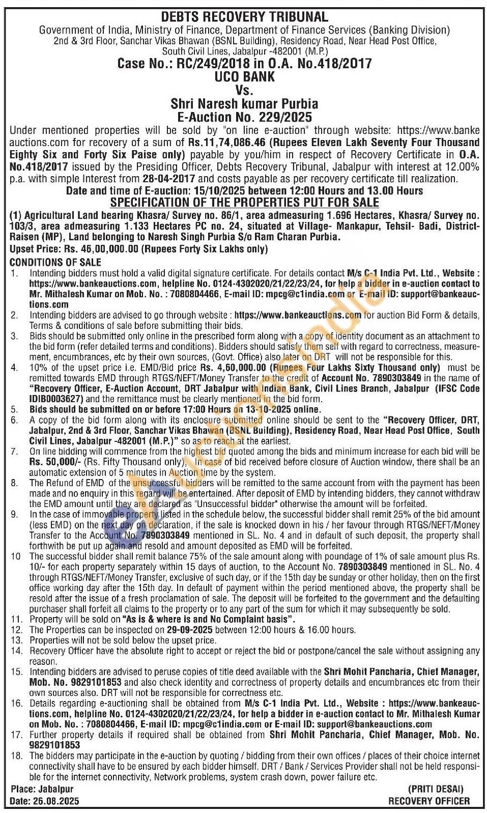 (1) Agricultural Land bearing Khasra/ Survey no. 86/1, area admeasuring 1.696 Hectares, Khasra/ Survey no. 103/3, area admeasuring 1.133 Hectares PC no. 24, situated at Village Mankapur, Tehsil Badi, District-Raisen (MP), Land belonging to Naresh Singh Purbia S/o Ram Charan Purbia