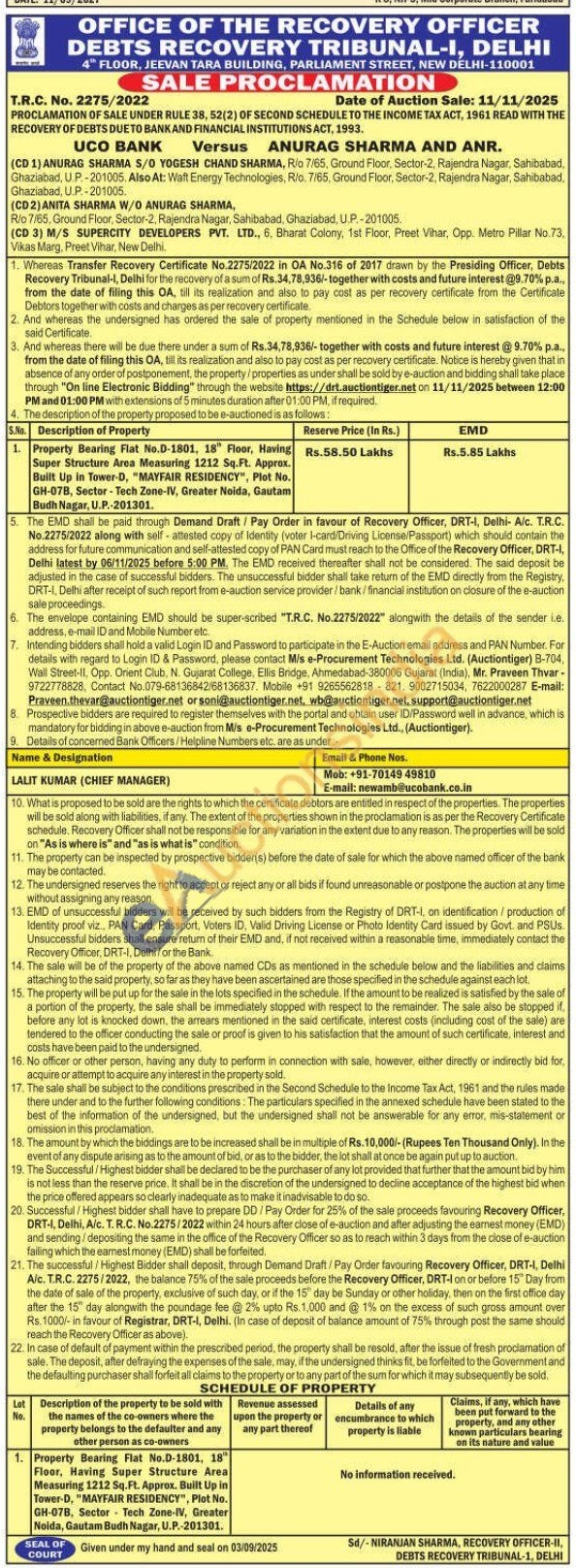 Property Bearing Flat No.D-1801, 18" Floor, Having Super Structure Area Measuring 1212 Sq.Ft. Approx. Built Up in Tower-D, "MAYFAIR RESIDENCY", Plot No. GH-07B, Sector-Tech Zone-IV, Greater Noida, Gautam Budh Nagar, U.P.-201301