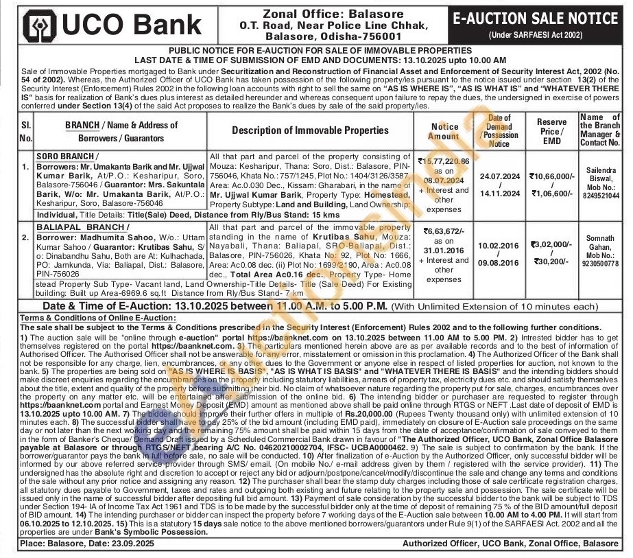 All that part and parcel of the property consisting of Mouza: Kesharipur, Thana: Soro, Dist.: Balasore, PIN-756046, Khata No.: 757/1245, Plot No.: 1404/3126/3587, Area: Ac.0.030 Dec., Kissam: Gharabari, in the name of Mr. Ujjwal Kumar Barik, Property Type: Homestead, Property Subtype: Land and Building, Land Ownership: