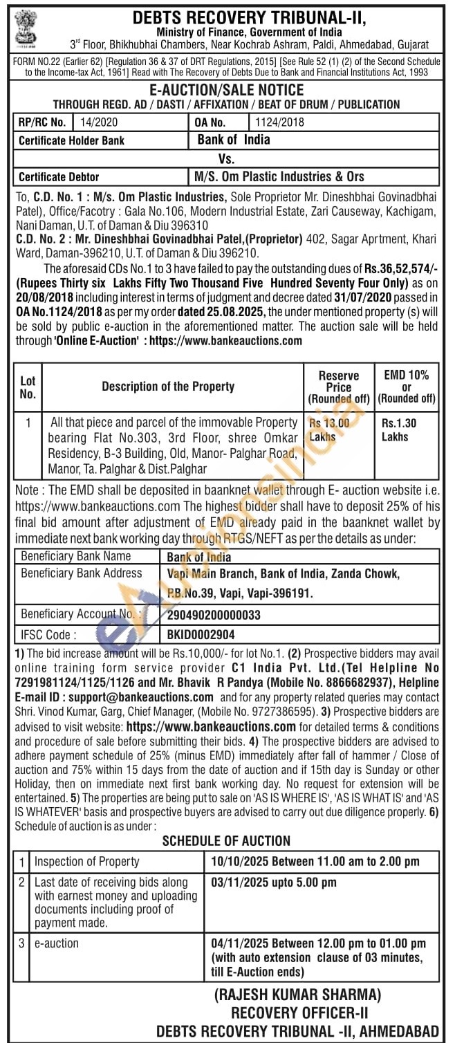 All that piece and parcel of the immovable Property bearing Flat No.303, 3rd Floor, shree Omkar Residency, B-3 Building, Old, Manor- Palghar Road, Manor, Ta. Palghar & Dist. Palghar