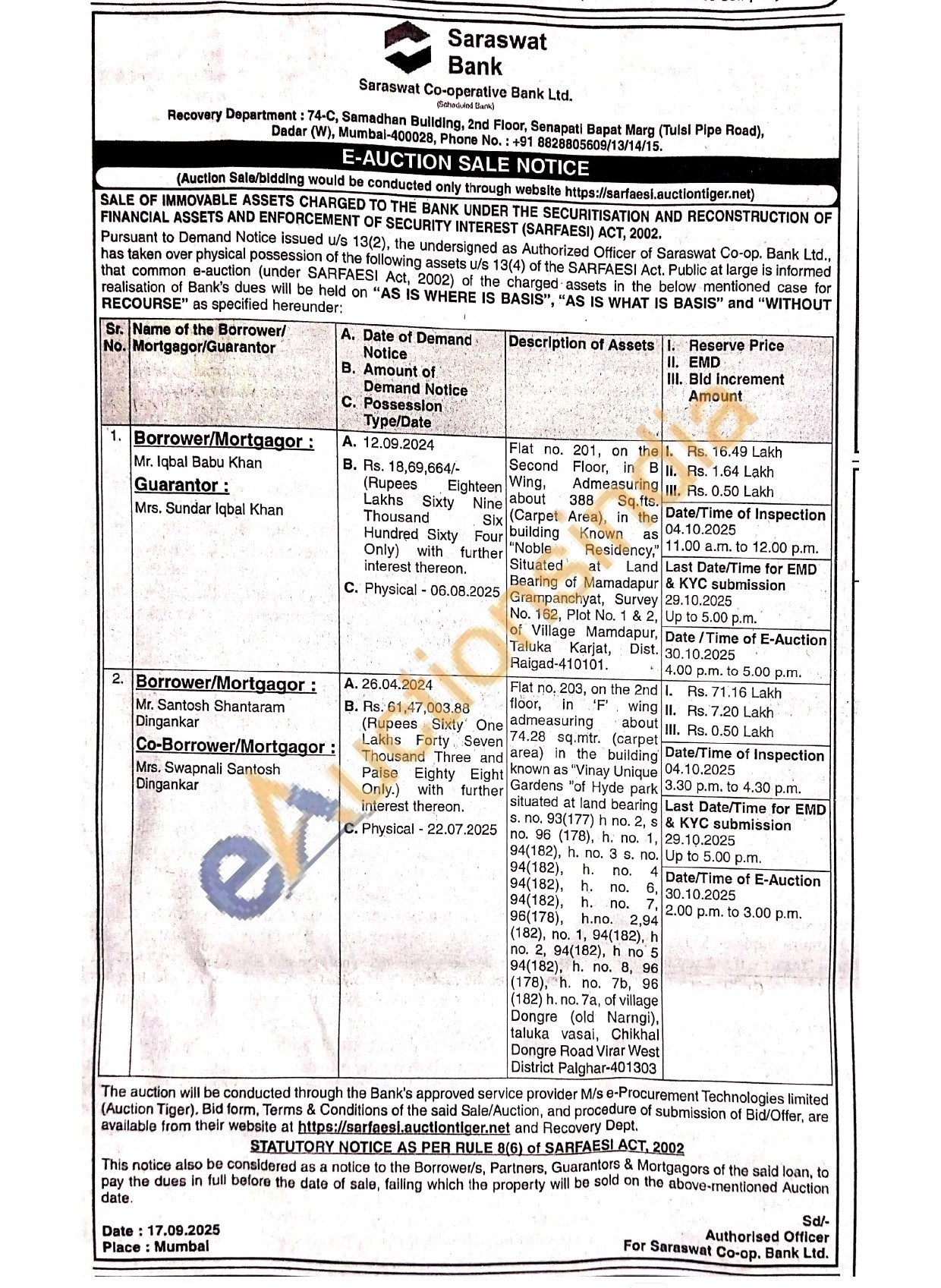 Flat no. 203, on the 2nd floor, in 'F' wing admeasuring 74.28 sq.mtr. (carpet about area) in the building known as "Vinay Unique Gardens "of Hyde park situated at land bearing s. no. 93(177) h no. 2, s no. 96 (178), h. no. 1, 94(182), h. no. 3 s. no. 94(182), h. no. 4 94(182), h. no. 6, 94(182), h. no. 7, 96(178), h.no. 2,94 (182), no. 1, 94(182), h no. 2, 94(182), h no 5 94(182), h. no. 8, 96 (178), h. no. 7b, 96 (182) h. no. 7a, of village Dongre (old Narngi), taluka vasai, Chikhal Dongre Road Virar West District Palghar-401303