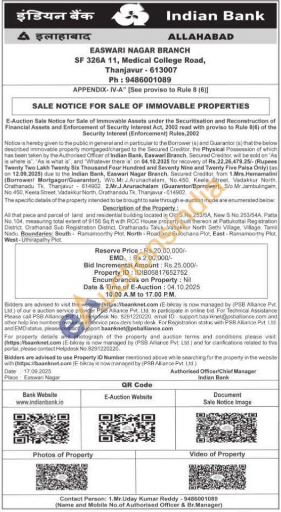 Description of the Property: All that piece and parcel of land and residential building located in Old S.No. 253/5A, New S.No.253/54A, Patta No. 104, measuring total extent of 9156 Sq.ft with RCC House property built thereon at Pattukottai Registration District, Orathanad Sub Registration District, Orathanadu Taluk, Vadakkur North Sethi Village, Village, Tamil Nadu Boundaries: South Ramamoorthy Plot, North - Road and Sulochana Plot, East-Ramamoorthy Plot, West-Uthirapathy Plot