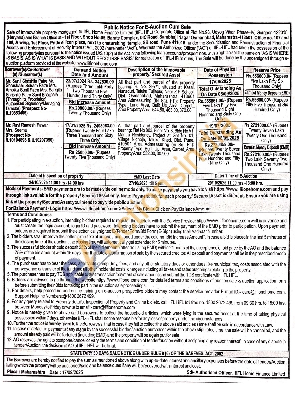 All that part and parcel of the property bearing: Flat No 803, Floor No. 8, Bldg No A1, Mantra Residency, Project at Gat No. 01, Village Nighoje, Taluka Khed, Dist. Pune, 410501 Area Admeasuring (in Sq. Ft.): Property Type: Built Up Area, Carpet Area Property Area: 532.00, 307.00